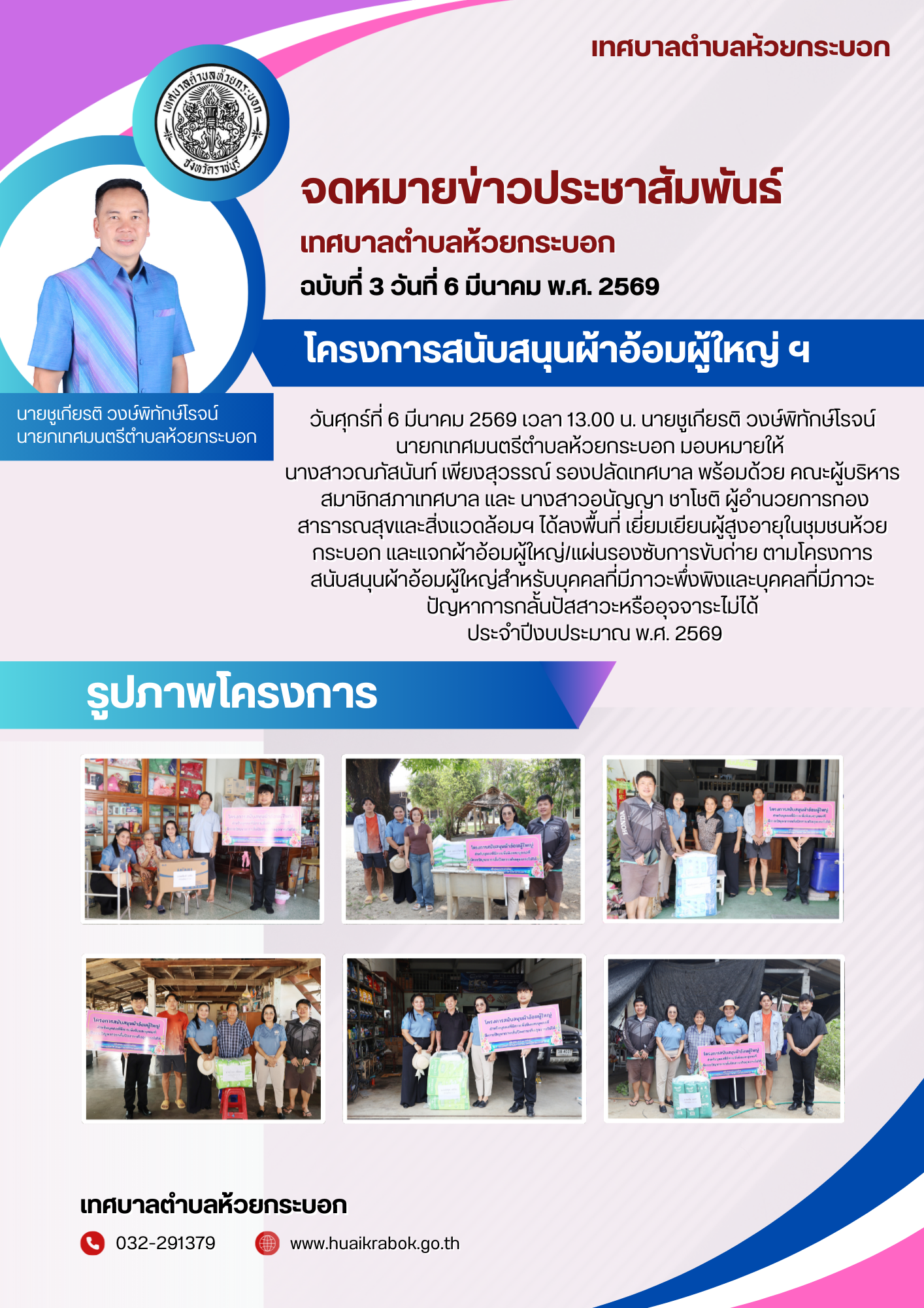 วันศุกร์ที่ 6 มีนาคม 2569 เวลา 13.00 น. นายชูเกียรติ วงษ์พิทักษ์โรจน์นายกเทศมนตรีตำบลห้วยกระบอก มอบหมายให้ นางสาวณภัสนันท์ เพียงสุวรรณ์ รองปลัดเทศบาล พร้อมด้วย คณะผู้บริหาร สมาชิกสภาเทศบาล เเละ นางสาวอนัญญา ชาโชติ ผู้อำนวยการกองสาธารณสุขและสิ่งแวดล้อมฯ ได้ลงพื้นที่ เยี่ยมเยียนผู้สูงอายุในชุมชนห้วยกระบอก เเละแจกผ้าอ้อมผู้ใหญ่/แผ่นรองซับการขับถ่าย ตามโครงการสนับสนุนผ้าอ้อมผู้ใหญ่สำหรับบุคคลที่มีภาวะพึ่งพิงและบุคคลที่มีภาวะปัญหาการกลั้นปัสสาวะหรืออุจจาระไม่ได้ ประจำปีงบประมาณ พ.ศ. 2569